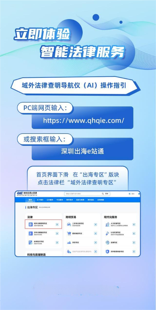 目前,该功能已嵌入“深圳出海e站通”平台首页的“出海专区—域外法律查明专区”,并与新闻动态、机构资讯、案例库等资源深度融合,为企业打造“一站式、集成化”的法律服务体验。